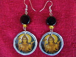 2012Earrings made from Recycled bottle caps. This one from jamu, an Indonesian herbal tonic with image of God. mixed with glass beads.